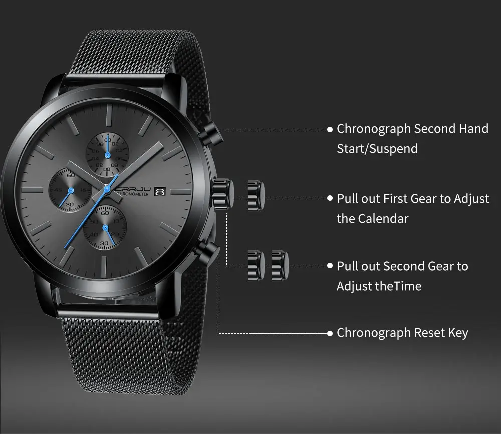 - Auto Date, chronograph, Complete Calendar, Day/Date, Water Resistant, Waterproof, LED Display, Luminous, Luminous Hands, Shock Resistant