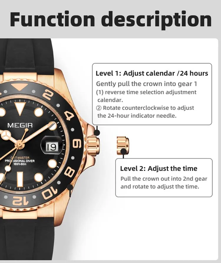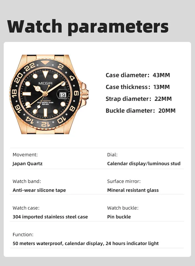 - chronograph, Day/Date, Water Resistant, Waterproof, Luminous