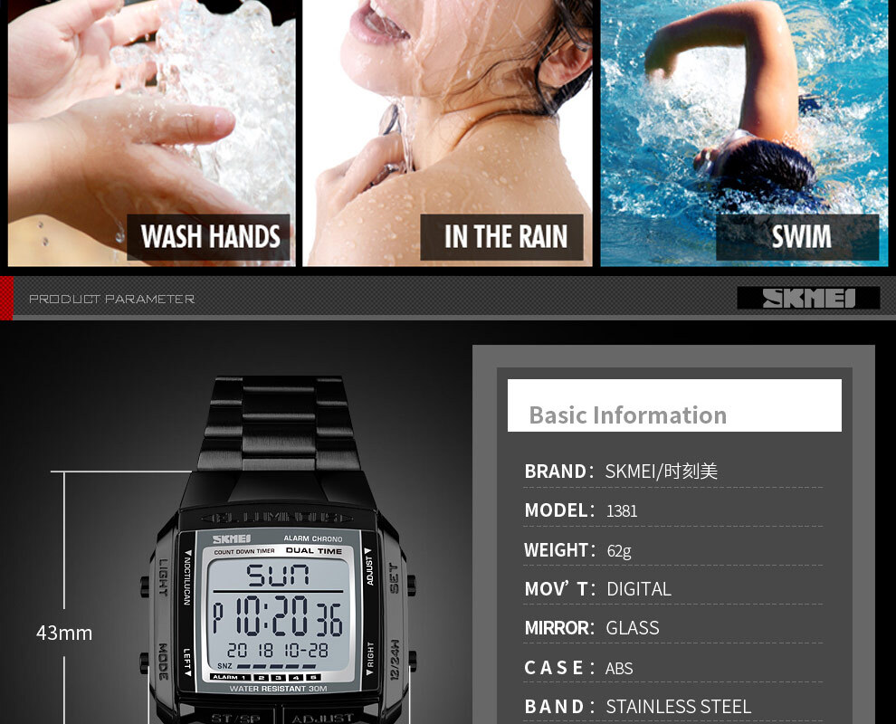 SKMEI 1381 Men Digital Stainless Steel Watch Week Date Alarm Luminous Wristwatch